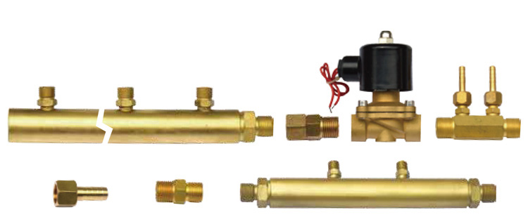 从左到右分别为多头分流排、活络接头、电磁阀、数控用小四通(或大四通或无数控配转换头)、进气螺母束接